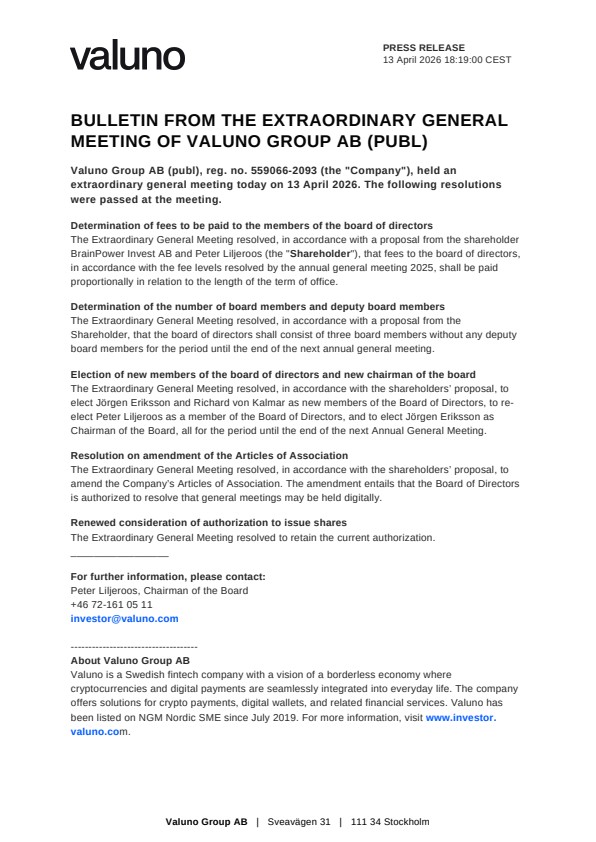 Valuno Group AB (publ), reg. no. 559066-2093 (the “Company”), held an extraordinary general meeting today on 13 April 2026. The following resolutions were passed at the meeting.