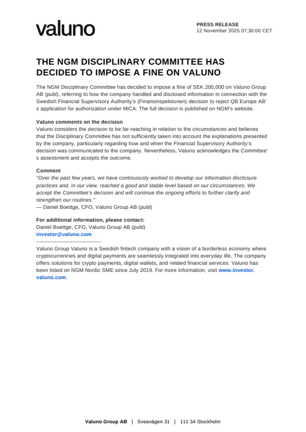 The NGM Disciplinary Committee has decided to impose a fine of SEK 200,000 on Valuno Group AB (publ), referring to how the company handled and disclosed information in connection with the Swedish Financial Supervisory Authority’s (Finansinspektionen) decision to reject QB Europe AB’s application for authorization under MiCA. The full decision is published on NGM’s website.
