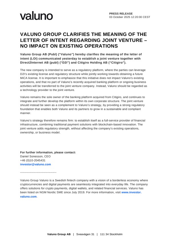 Valuno Group AB (Publ) (“Valuno”) hereby clarifies the meaning of the letter of intent (LOI) communicated yesterday to establish a joint venture together with Direct2Internet AB (publ) (“D2I”) and Citigiro Holding AB (“Citigiro”).