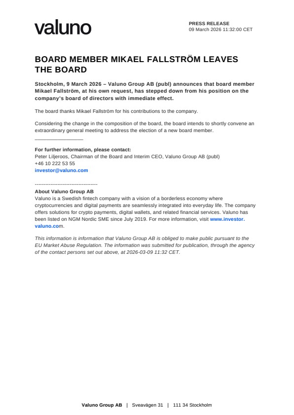 Stockholm, 9 March 2026 – Valuno Group AB (publ) announces that board member Mikael Fallström, at his own request, has stepped down from his position on the company’s board of directors with immediate effect.