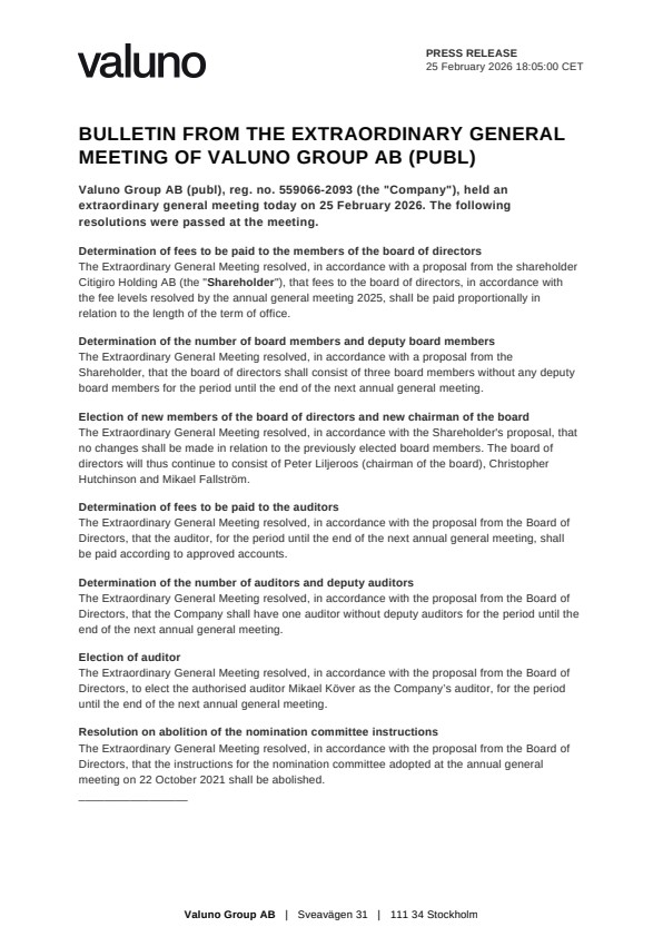 Valuno Group AB (publ), reg. no. 559066-2093 (the ”Company”), held an extraordinary general meeting today on 25 February 2026. The following resolutions were passed at the meeting.