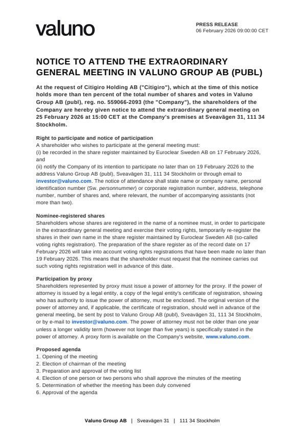 At the request of Citigiro Holding AB (”Citigiro”), which at the time of this notice holds more than ten percent of the total number of shares and votes in Valuno Group AB (publ), reg. no. 559066-2093 (the ”Company”), the shareholders of the Company are hereby given notice to attend the extraordinary general meeting on 25 February 2026 at 15:00 CET at the Company’s premises at Sveavägen 31, 111 34 Stockholm.