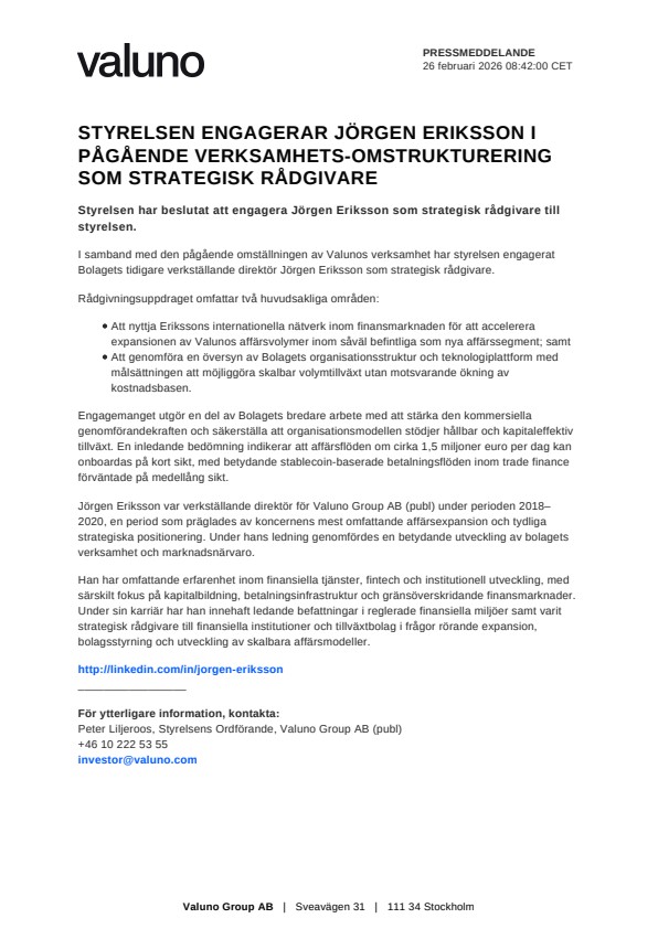 I samband med den pågående omställningen av Valunos verksamhet har styrelsen engagerat Bolagets tidigare verkställande direktör Jörgen Eriksson som strategisk rådgivare.