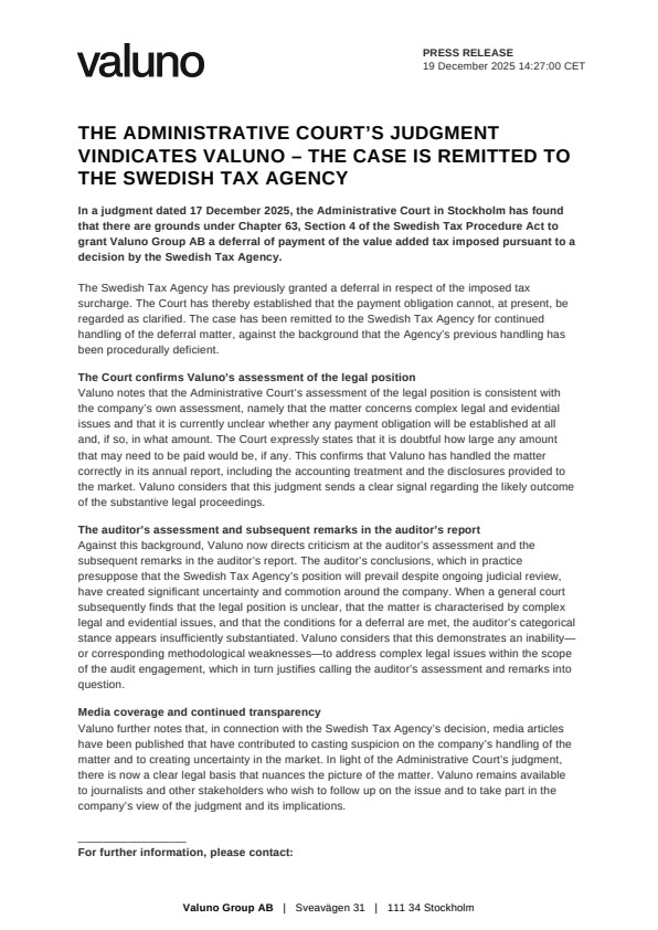 Valuno further notes that, in connection with the Swedish Tax Agency’s decision, media articles have been published that have contributed to casting suspicion on the company’s handling of the matter and to creating uncertainty in the market. In light of the Administrative Court’s judgment, there is now a clear legal basis that nuances the picture of the matter. Valuno remains available to journalists and other stakeholders who wish to follow up on the issue and to take part in the company’s view of the judgment and its implications.