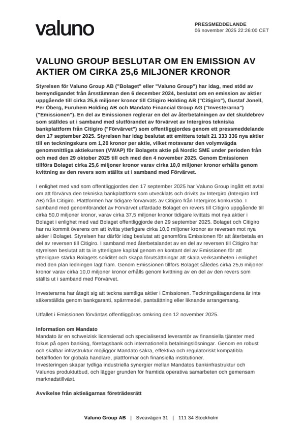 Styrelsen för Valuno Group AB (”Bolaget” eller ”Valuno Group”) har idag, med stöd av bemyndigandet från årsstämman den 6 december 2024, beslutat om en emission av aktier uppgående till cirka 25,6 miljoner kronor till Citigiro Holding AB (”Citigiro”), Gustaf Jonell, Per Öberg, Furuhem Holding AB och Mandato Financial Group AG (”Investerarna”) (”Emissionen”). En del av Emissionen reglerar en del av återbetalningen av det skuldebrev som ställdes ut i samband med slutförandet av förvärvet av Intergiros tekniska bankplattform från Citigiro (”Förvärvet”) som offentliggjordes genom ett pressmeddelande den 17 september 2025. Styrelsen har idag beslutat att emittera totalt 21 333 336 nya aktier till en teckningskurs om 1,20 kronor per aktie, vilket motsvarar den volymvägda genomsnittliga aktiekursen (VWAP) för Bolagets aktie på Nordic SME under perioden från och med den 29 oktober 2025 till och med den 4 november 2025. Genom Emissionen tillförs Bolaget cirka 25,6 miljoner kronor varav cirka 10,0 miljoner kronor erhålls genom kvittning av den revers som ställts ut i samband med Förvärvet.
