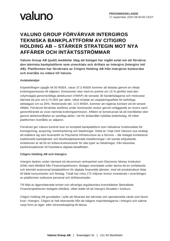 Valuno Group AB (publ) meddelar idag att bolaget har ingått avtal om att förvärva den tekniska bankplattform som utvecklats och driftats av Intergiro (Intergiro Intl AB). Plattformen har förvärvats av Citigiro Holding AB från Intergiros konkursbo och överlåts nu vidare till Valuno.