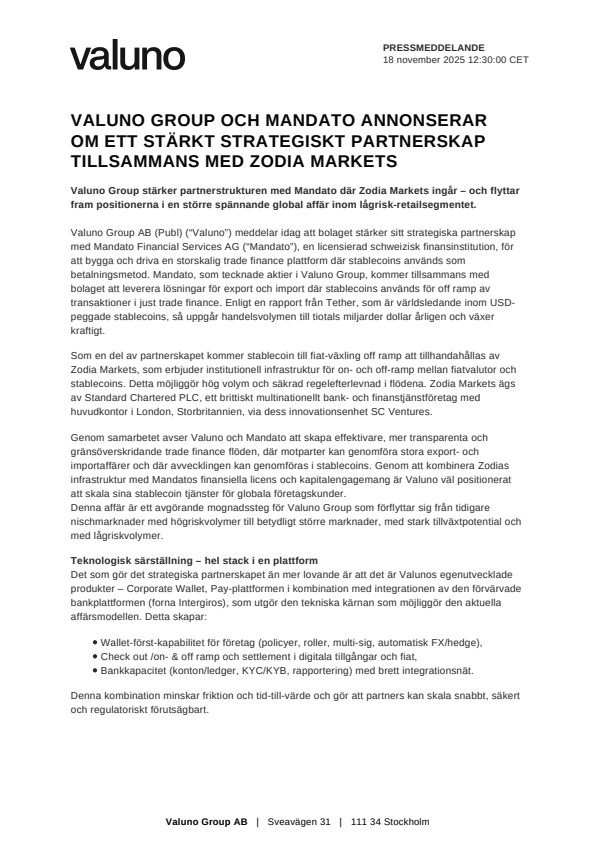 Valuno Group AB (Publ) (“Valuno”) meddelar idag att bolaget stärker sitt strategiska partnerskap med Mandato Financial Services AG (“Mandato”), en licensierad schweizisk finansinstitution, för att bygga och driva en storskalig trade finance plattform där stablecoins används som betalningsmetod. Mandato, som tecknade aktier i Valuno Group, kommer tillsammans med bolaget att leverera lösningar för export och import där stablecoins används för off ramp av transaktioner i just trade finance. Enligt en rapport från Tether, som är världsledande inom USD-peggade stablecoins, så uppgår handelsvolymen till tiotals miljarder dollar årligen och växer kraftigt.
