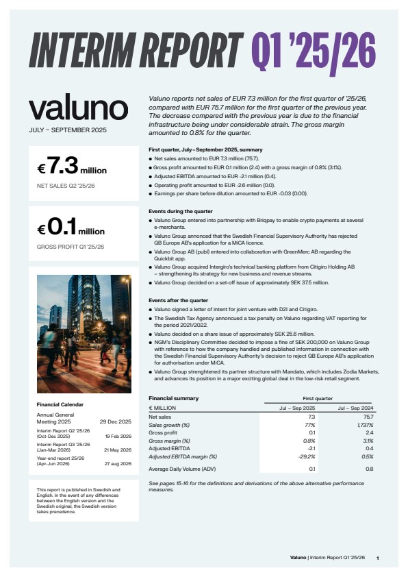 Valuno rapporterar en nettoomsättning om 7,3 mEUR under det första kvartalet ’25/26, att jämföra med 75,7 mEUR under första kvartalet föregående år. Minskningen mot föregående år beror på att den finansiella infrastrukturen drabbats av stora påfrestningar. Bruttomarginalen uppgick till 0,8% i kvartalet.
